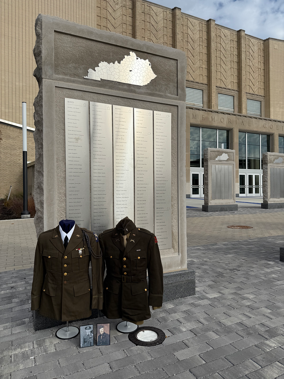 John's uniforms in front of the new Boyd County list of names at Memorial Coliseum at the University of Kentucky.