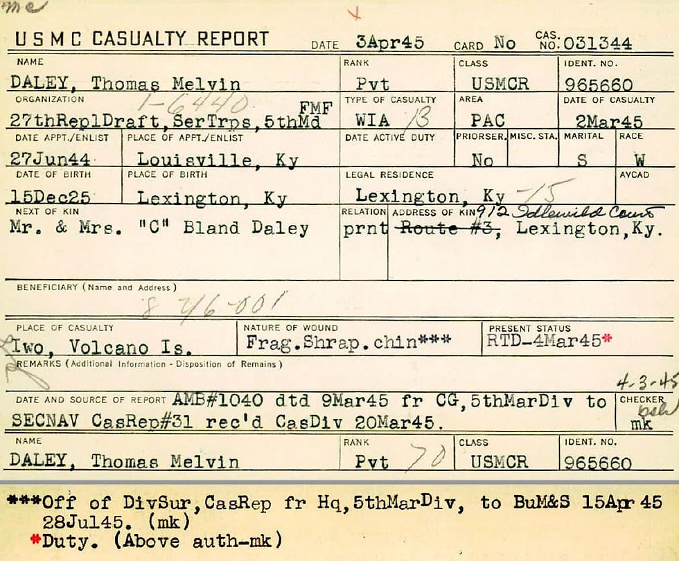 After sustaining over 2,600 casualties, compared to an initial assault force of just over 3,000, the 26th Marine Regiment was permitted to leave immediately for Hawaii for rest and reorganization. Although for most of the men this was the last time they would ever see the island, the things they had witnessed there remained in their memories forever. “The memories do linger,” recalled Private Robert Gasche, one of Daley’s company-mates who had also been wounded on the March 2 attack, “but you just have to cope with that.”
