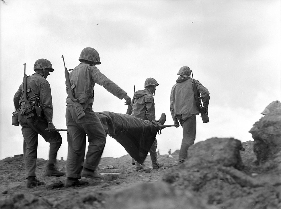 Stretcher-bearers evacuating a wounded marine.
