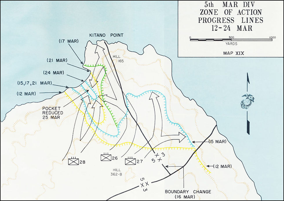 On March 11, 3/26 rejoined the rest of the 26th Marines and took part in a new attack northward, gaining nearly 1,000 yards. Like clockwork, the men would advance through the rocky valleys until Japanese troops opened fire. The marines would then dash into cover and wait for a Sherman dozer to move forward and blast the caves or strongpoints, or use flamethrowers to flush it out, and continue moving forward. These tactics proved the most successful in working through the difficult terrain. From March 12-13, the division was in reserve and mostly reorganized its many replacements.